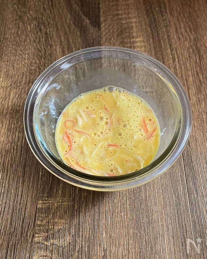 (2) パックご飯を温めている間に、卵、【A】、ほぐしたカニカマを混ぜ合わせておく。
