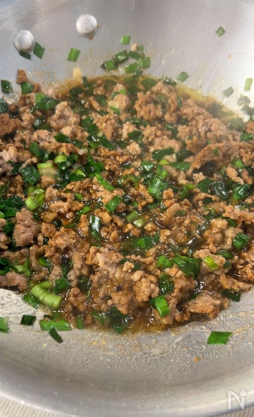 (1) フライパンにごま油と豚ひき肉を入れて中火で炒める。