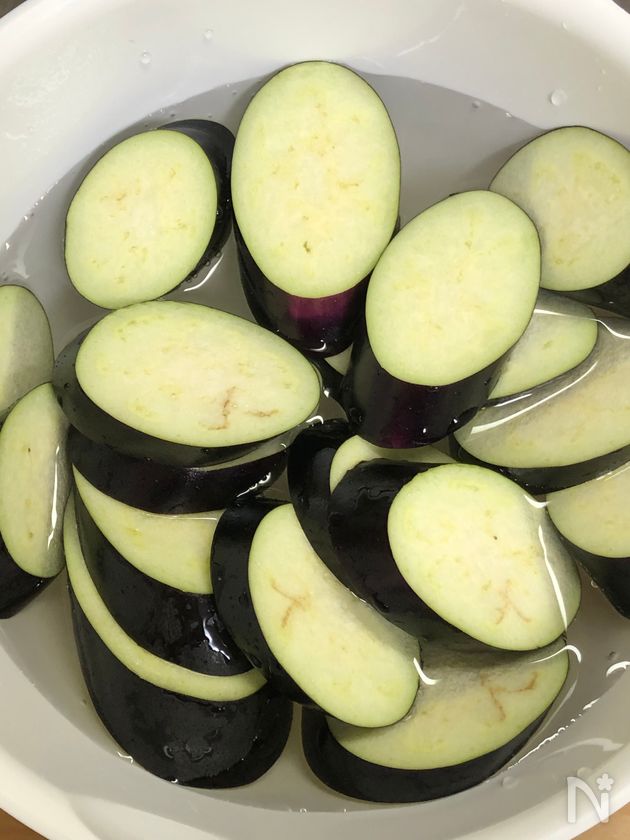 (1) なすはヘタを落とし、1cm幅ほどに斜め切りにする。