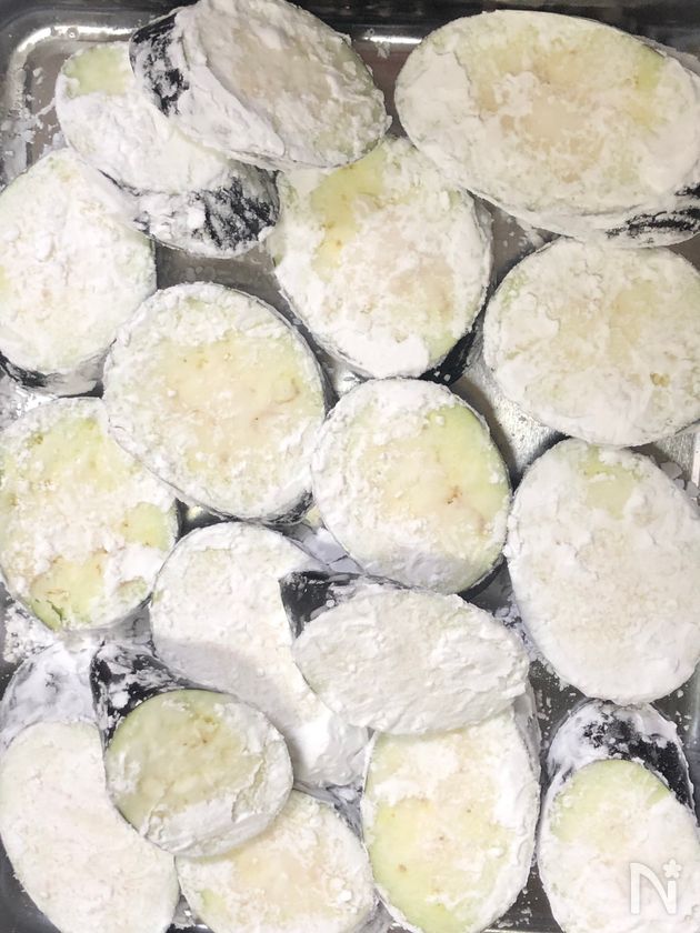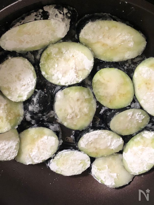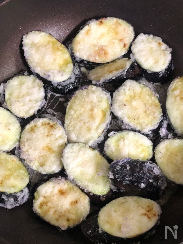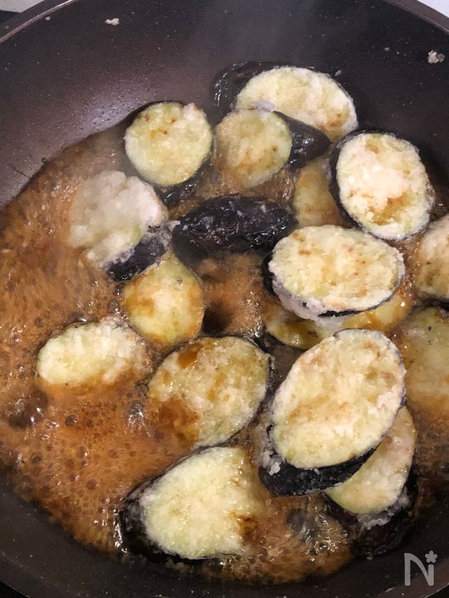(3) フライパンにサラダ油を熱し、なすを加え両面じっくりと揚げ焼きにする。