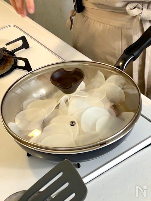 (2) 大根は皮付きのままよく洗ってスライサーで薄くスライスしてフライパンにいれ、塩をふりかけて全体に広げる。
