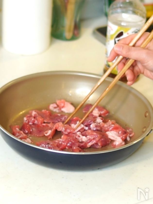 (1) フライパンにサラダ油をひき、豚こま切れ肉をいれて下味【A】をふりいれてなじませる。
