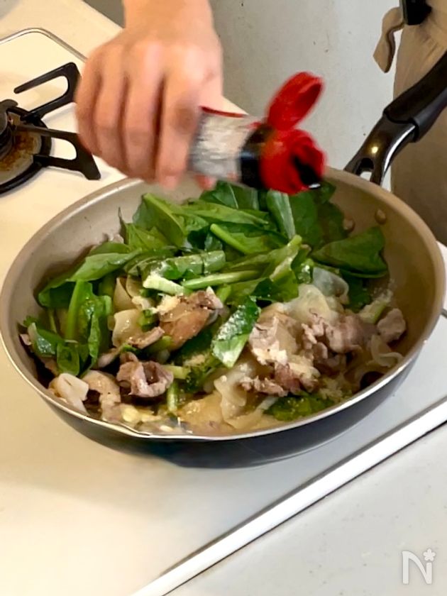 (3) フタをして弱目の中火にかけ豚肉がこんがり焼き目がつくまで3~4分加熱する。