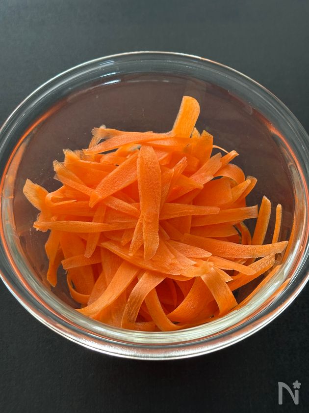 (1) にんじんはピーラーで皮を剥き、そのままピーラーでスライスする。