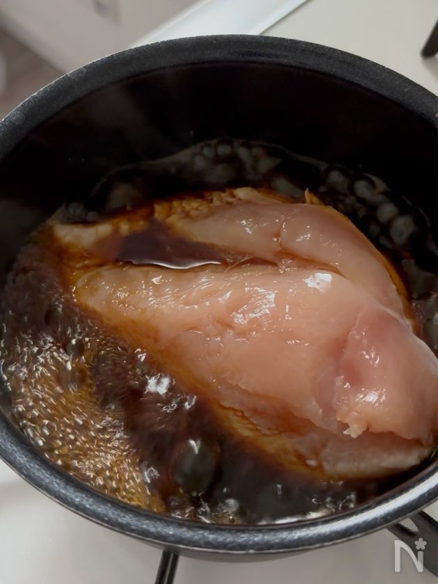 煮立ったら鶏むね肉を加え、蓋をせずに弱めの中火で5分煮る。