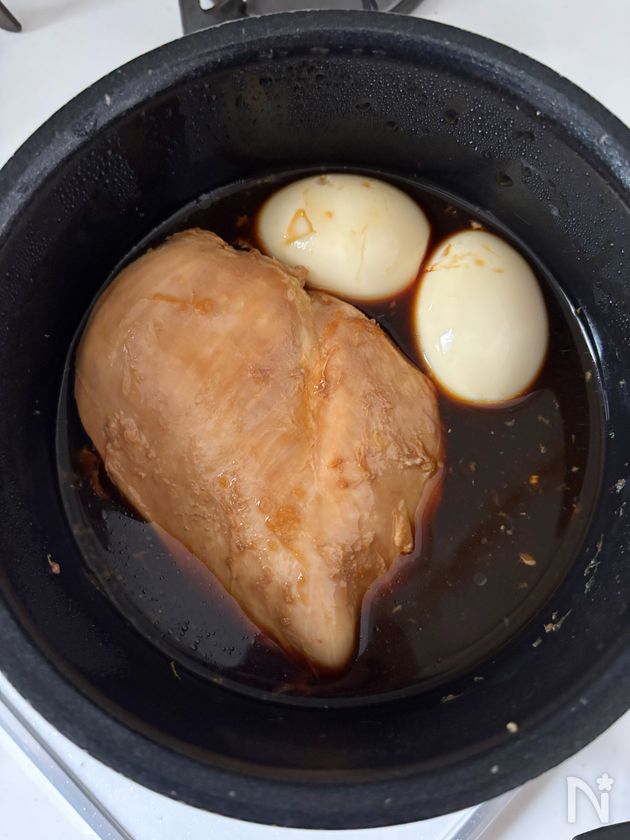 粗熱が取れたら途中でゆで卵を加えて漬ける。