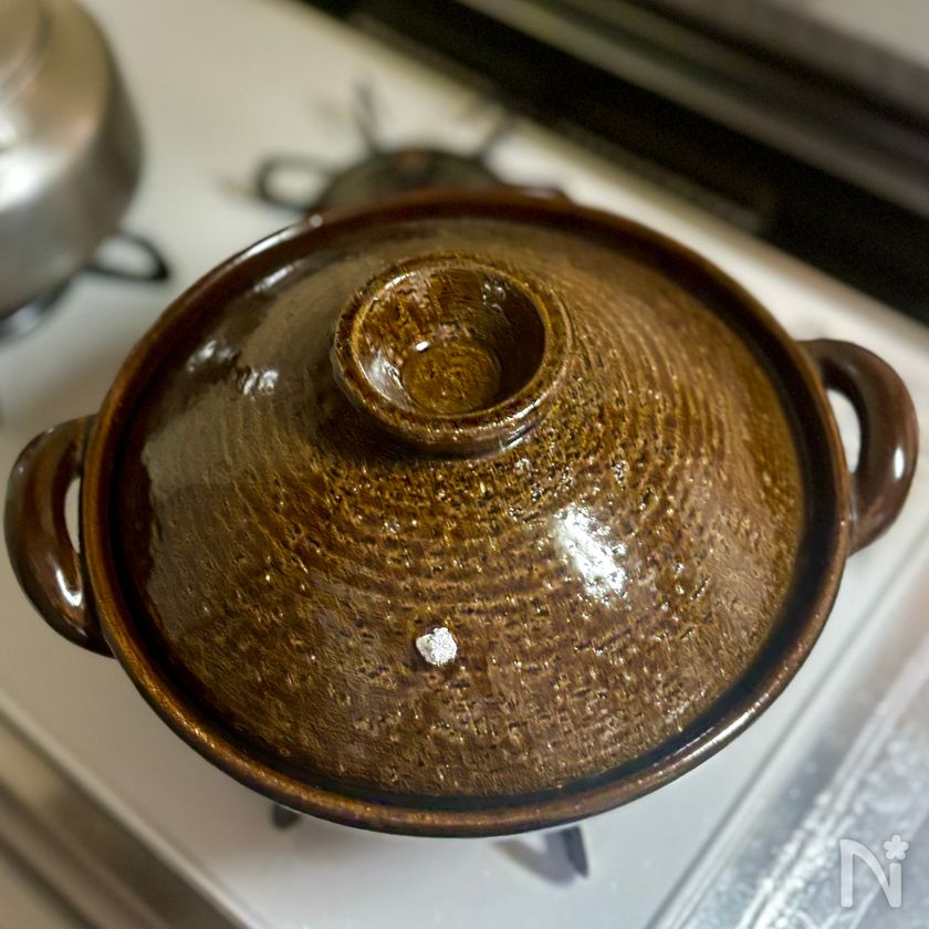 強火にかけ、煮立ってふたのすき間から蒸気が上がってきたら弱火にし、10分炊く。