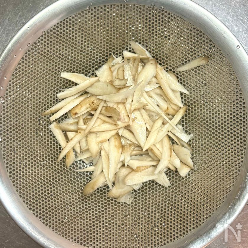 (4) ごぼうはよく洗ってささがきにし、サッと水にさらして水気をきり、ペーパータオルで水気をしっかり拭く。