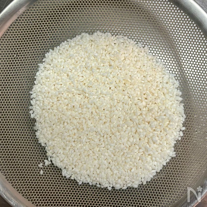 (下準備) 米は洗って15分ほど浸水させ、ざるに上げて水気をきる。