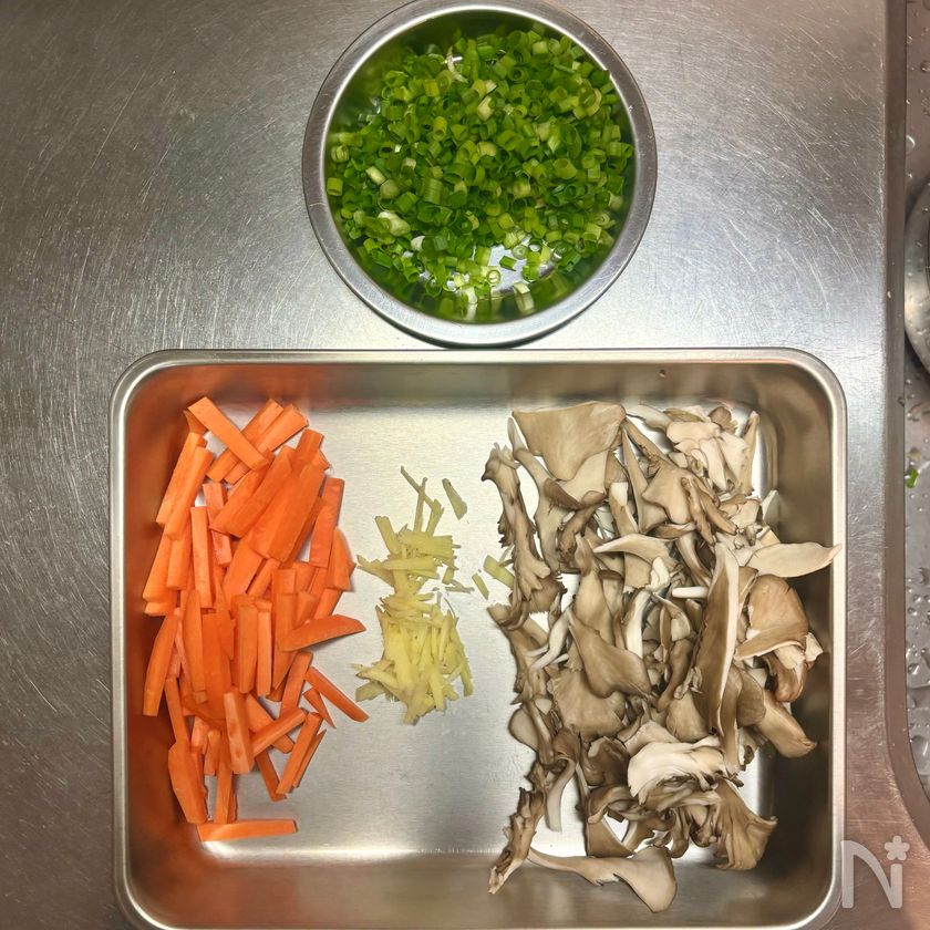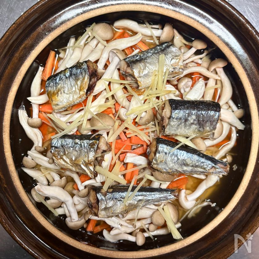 ごぼう、にんじん、しめじ、2のさんまを順にのせ、しょうがをちらす。