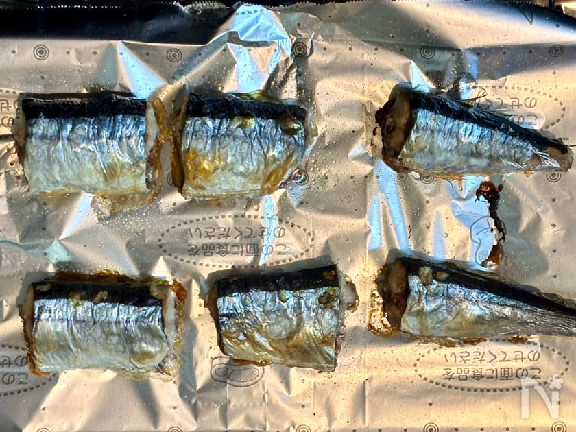 (2) グリルの網にサラダ油少々(分量外)を塗って(又はグリルに付着防止加工アルミホイルを敷いて)熱し、ペーパータオルで水気を拭いたさんまを並べ入れ、8〜10分ほどこんがりと焼く。
