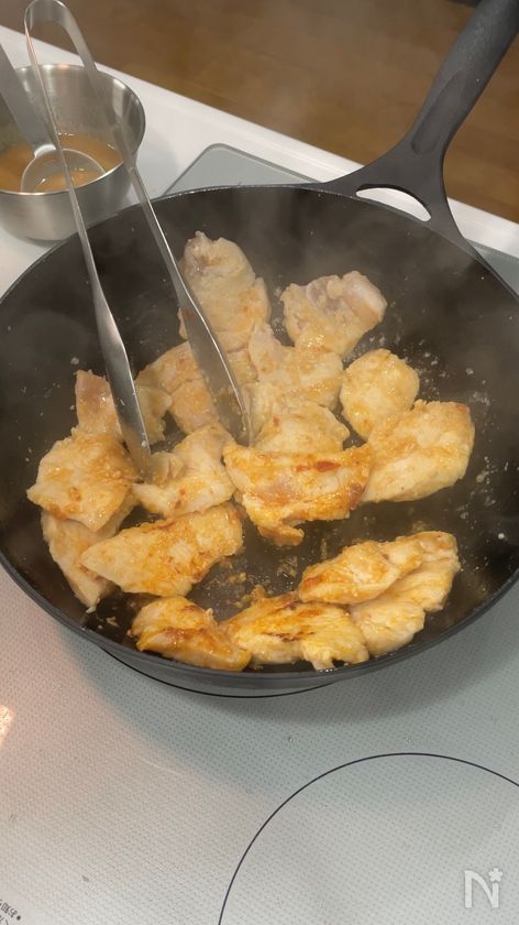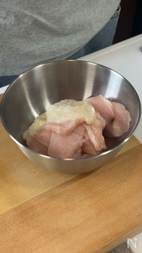 (下準備) 鶏むね肉を薄く切り、塩麹を加えて揉み込み30分~1時間ほど置く。