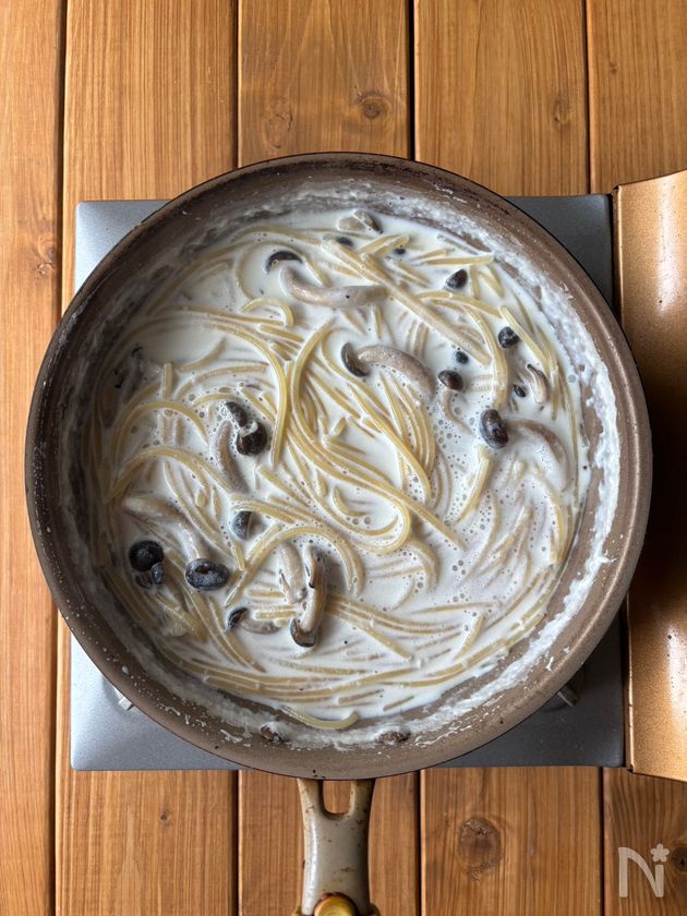 (3) しめじがしんなりとしてきたら半分に折ったスパゲティと【B】を加え、スパゲティをほぐしながら、表記時間通り加熱をする。