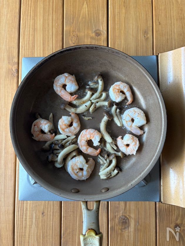 (2) 中火で熱したフライパンにしめじ、むきえび、【A】を加えて炒める。