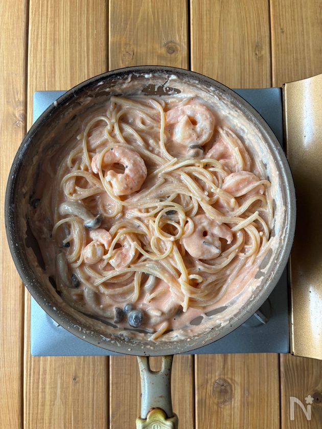 ワンパンで!【濃厚海老トマトクリームパスタ】生クリーム不要♩
