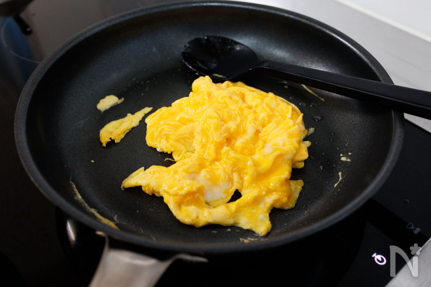 (2) フライパンにサラダ油を中火でよく熱し、溶き卵を半熟状に炒めて取り出し、ざっくりとほぐす。フライパンの表面をペーパーで拭き取っておく。