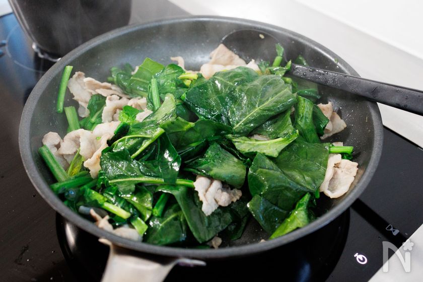 (3) フライパンを中火で熱し、豚肉を炒めて火が通ってきたら、酒を加えて炒める。さらに、ほうれん草を加えて、軽くしんなりするまで炒める。