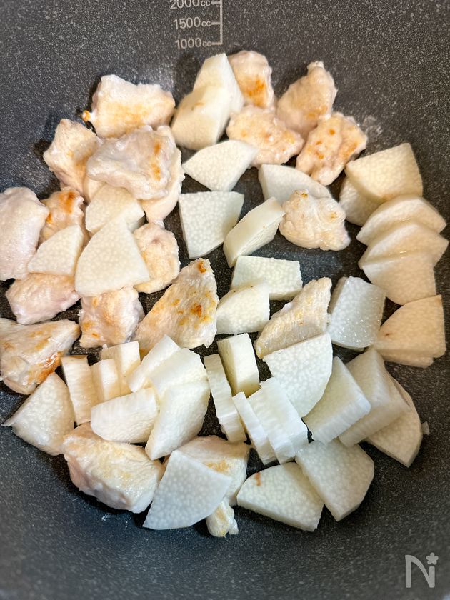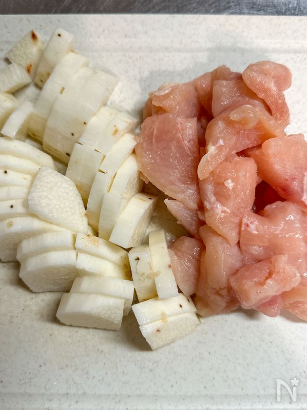 (下準備) 鶏むね肉はひと口大に、長いもは皮をむき、いちょう切りにする。