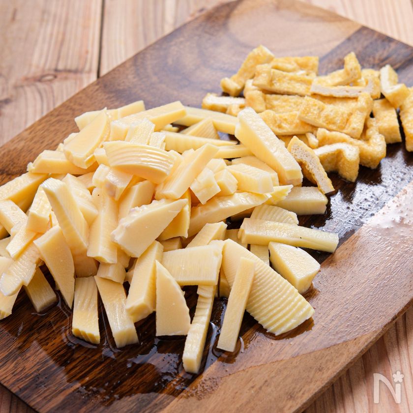 (1) たけのこと油揚げは短冊切りにする。