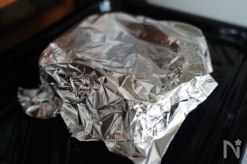 (4) アルミホイルを上に被せて、180℃に予熱したオーブンで15分焼く。