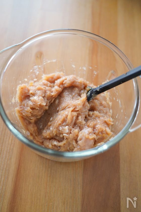 (1) フードプロセッサーに、皮を取り除いた鶏むね肉をそぎ切りにして入れる。卵と【A】を加えてよく混ぜ合わせる。