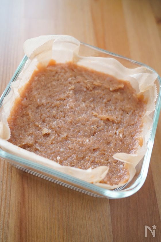 (2) 耐熱容器にオーブンシートを敷き、1を入れ厚さ2〜3cmになるように平にならす。
