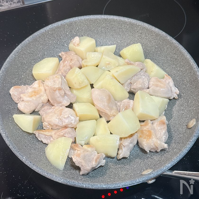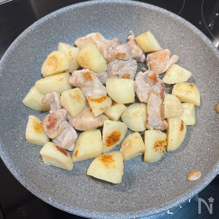 (2) フライパンにサラダ油を熱し、鶏もも肉を皮目から焼く。焼き色がついたら裏返して両面焼き、加熱したじゃがいもを加えて炒める。