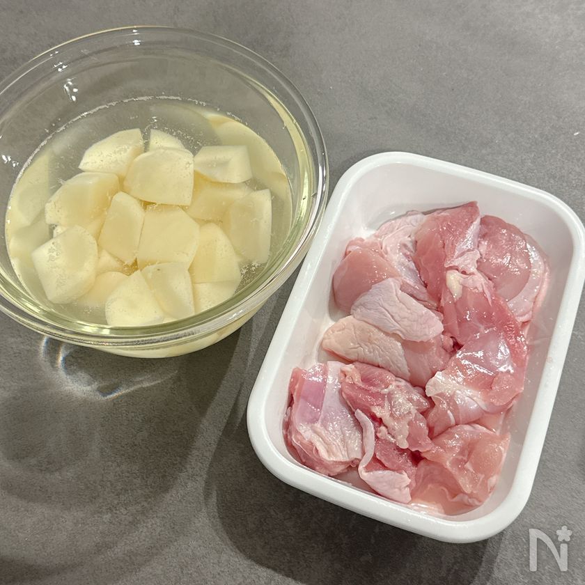 (1) 鶏もも肉は食べやすい大きさに切る。じゃがいもは皮をむいて6〜8等分に切り水にさらした後、水気を切って600Wの電子レンジで6分間加熱する。