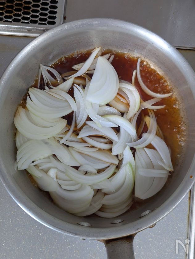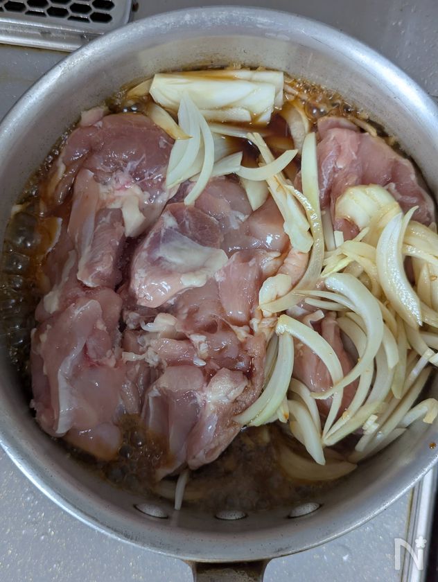 (2) 玉ねぎと・調味料【A】を鍋に入れて煮立たせたら皮目を下にして鶏もも肉を入れ、蓋をして弱火で10分煮込む。
