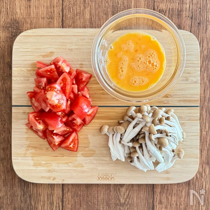 (1) 卵はコシがなくなるまで溶きほぐす。トマトは食べやすい大きさに切り、しめじは小房に分ける。