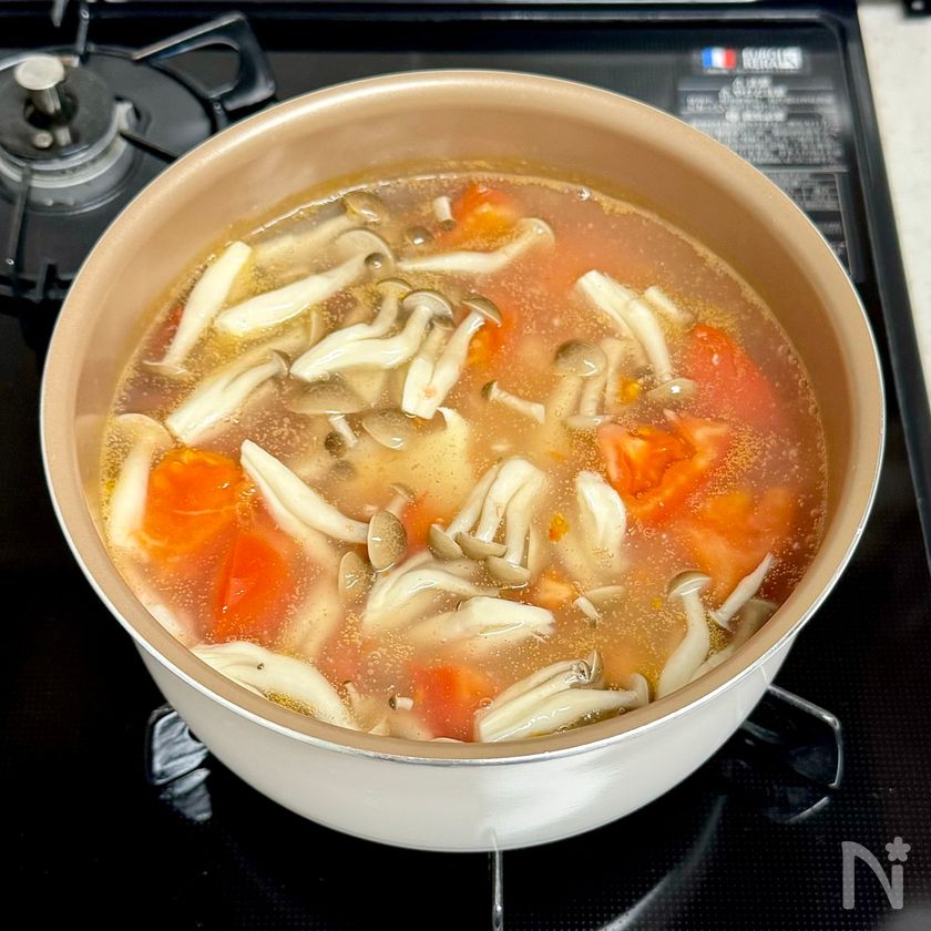(2) 鍋に水と【A】を入れてよく混ぜ合わせてから中火にかける。ひと煮立ちさせたら、しめじ、トマトを加え、木綿豆腐を手でくずしながら落とし入れる。