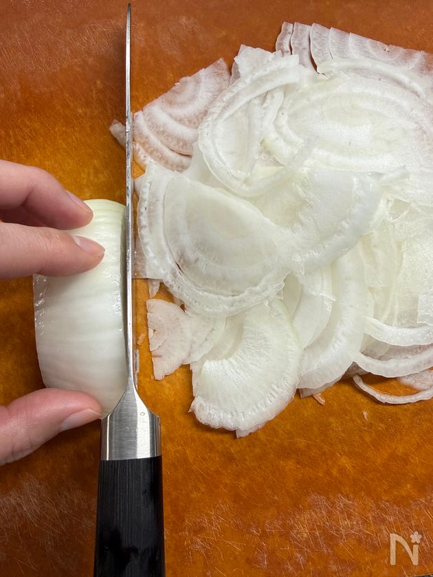 (1) 新玉ねぎは皮を剥き、繊維を断つように薄切りにする。