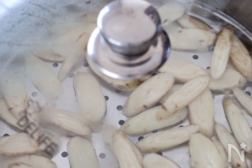 (3) 蒸し器にごぼうを入れて中火で7分蒸す