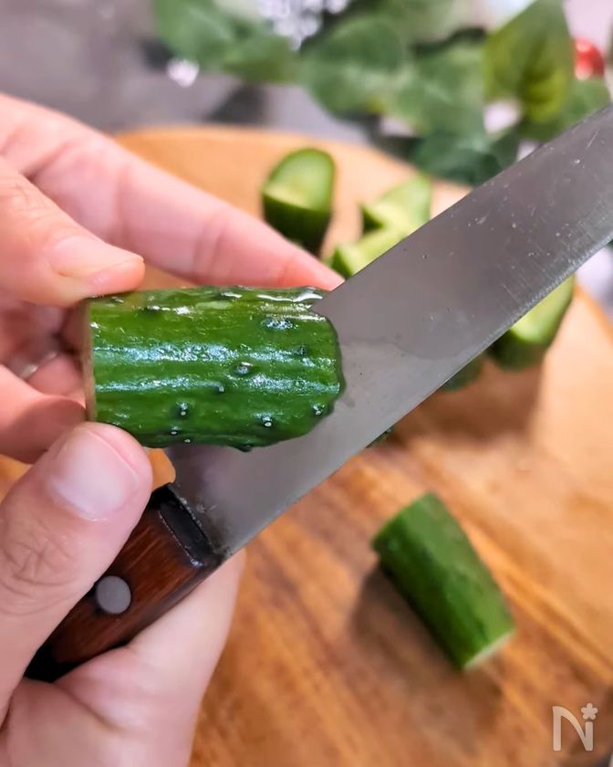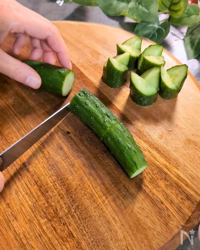 (2) きゅうりの側面に縦2cmくらいの切れ込みを表と裏に入れる。