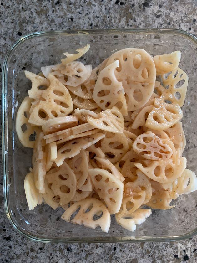 (1) 耐熱容器に蓮根を入れて【A】を入れて混ぜ合わせて、ふんわりラップをする。