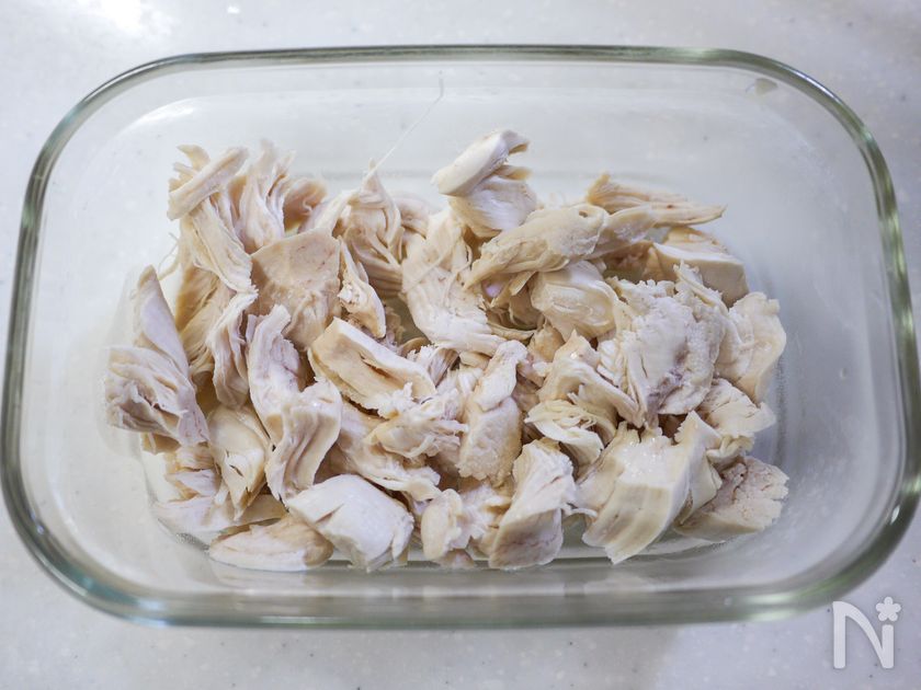 (2) 鶏ささ身肉は沸騰したお湯に入れて5分加熱して火を止めて