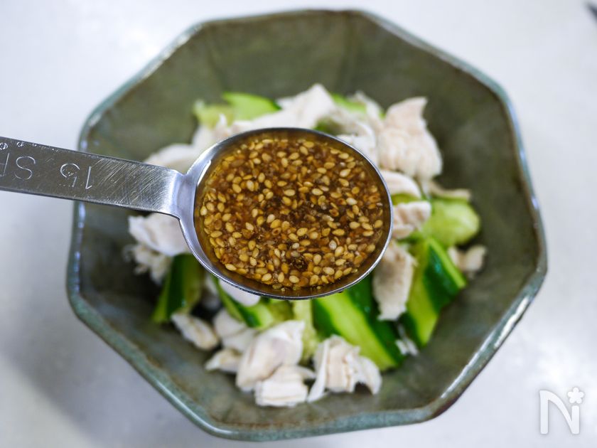 (3) 器にきゅうりとささ身肉を盛って混ぜ合わせた【A】を