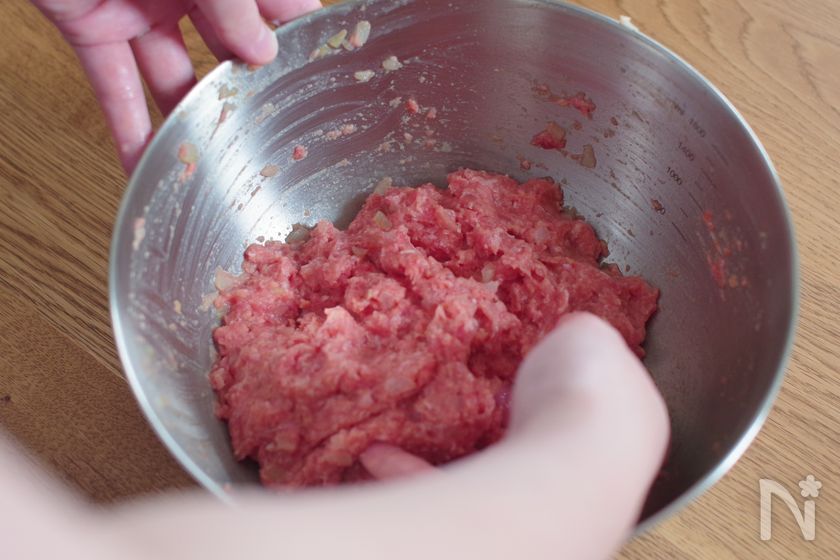 (1) ボウルに合い挽き肉、冷ました玉ねぎ、【A】を加えよくこねて4等分にする。