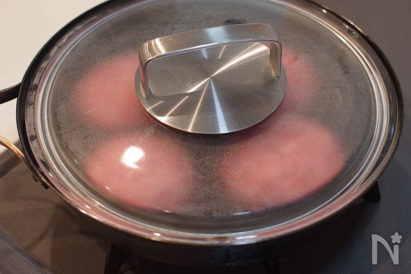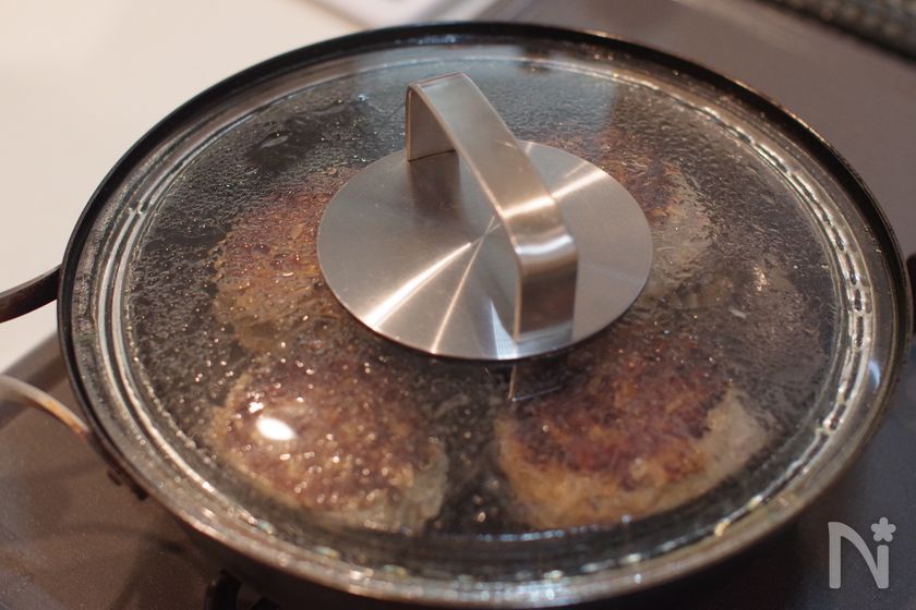 (3) 蓋をして中火で3分焼く。焼き色をつけて表面をかためます。