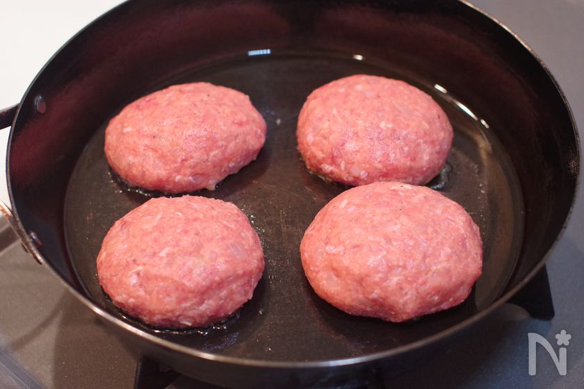 (2) フライパンに油をひいておく。ハンバーグを空気を抜きながら成形してフライパンに並べる。