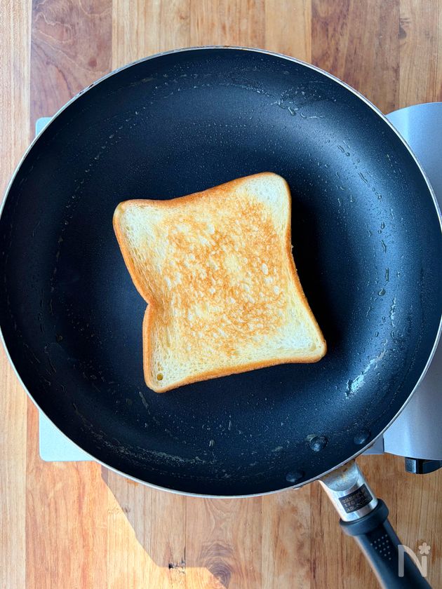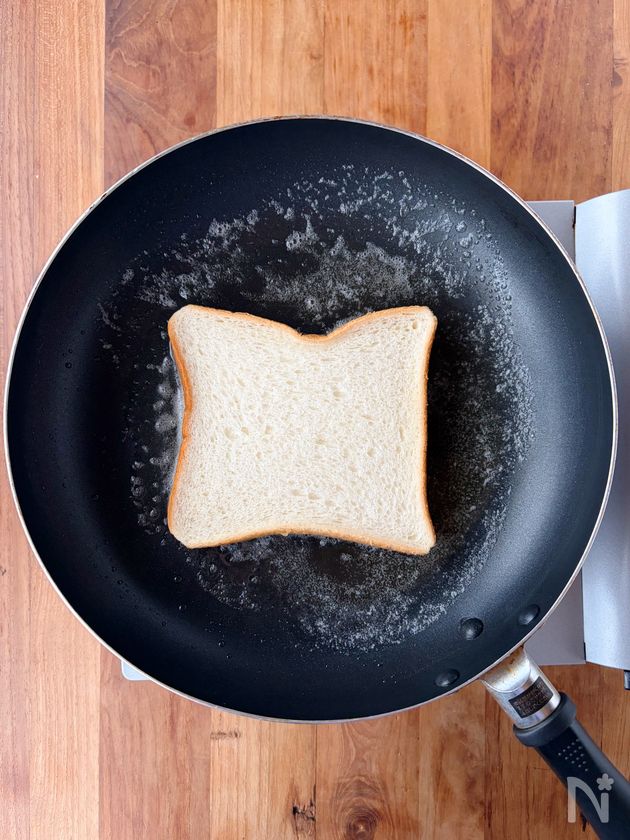(2) バターが溶けたら弱火にし、食パンを入れてこんがり焼き色がつくまで焼く