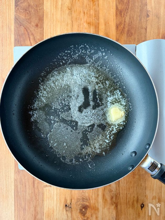 (1) フライパンに薄くサラダ油を塗り、バターを入れて中火にかける