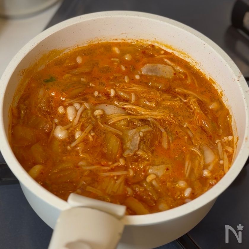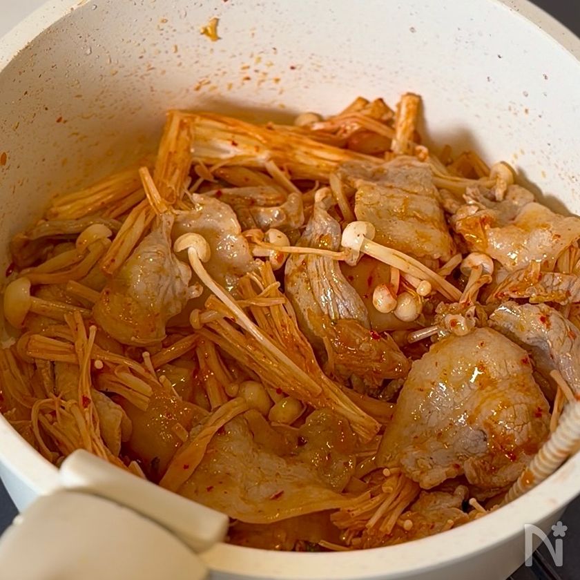 (3) 豚バラ肉に火が通ったら、えのき・キムチを加えてさっと炒める。