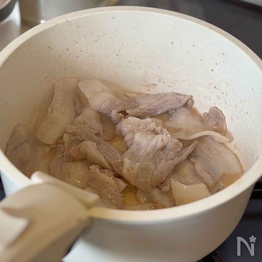 (2) 鍋にごま油をひき、豚バラ肉を炒める。