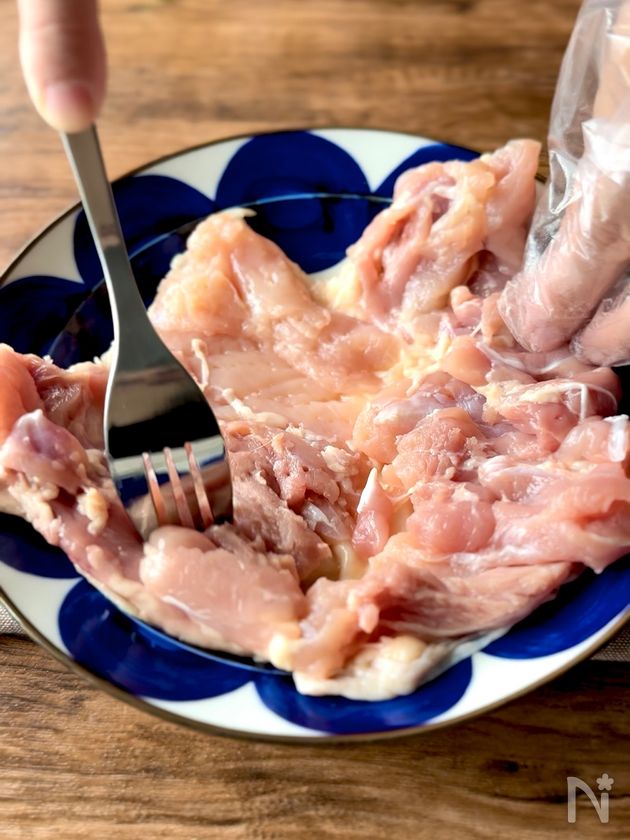 (1) 鶏もも肉は厚い部分を開き、余分な脂や軟骨を取り除く。フォークで数カ所さす。