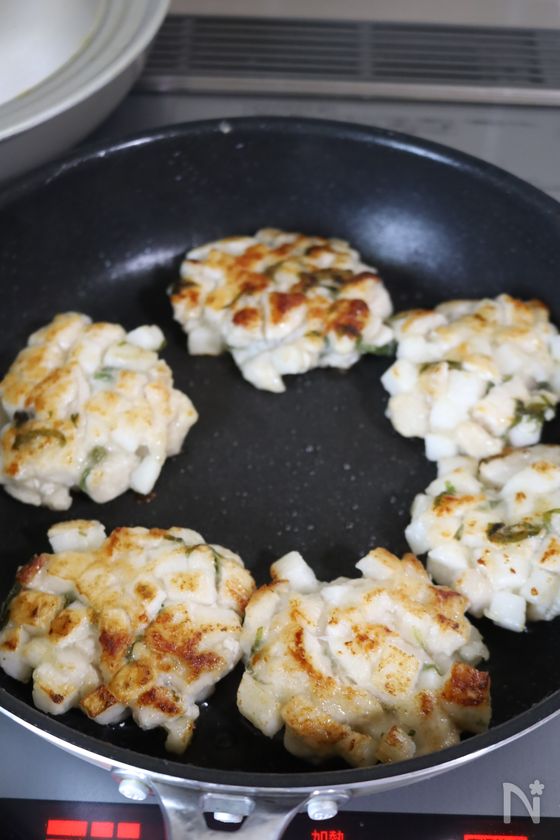 •長芋が大きいとくっつきにくいので、1cm弱くらいに切ると上手くいきやすいです。どうしてもまとまりづらい場合は、マヨネーズ、片栗粉を少し増やしてみてください。