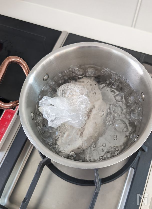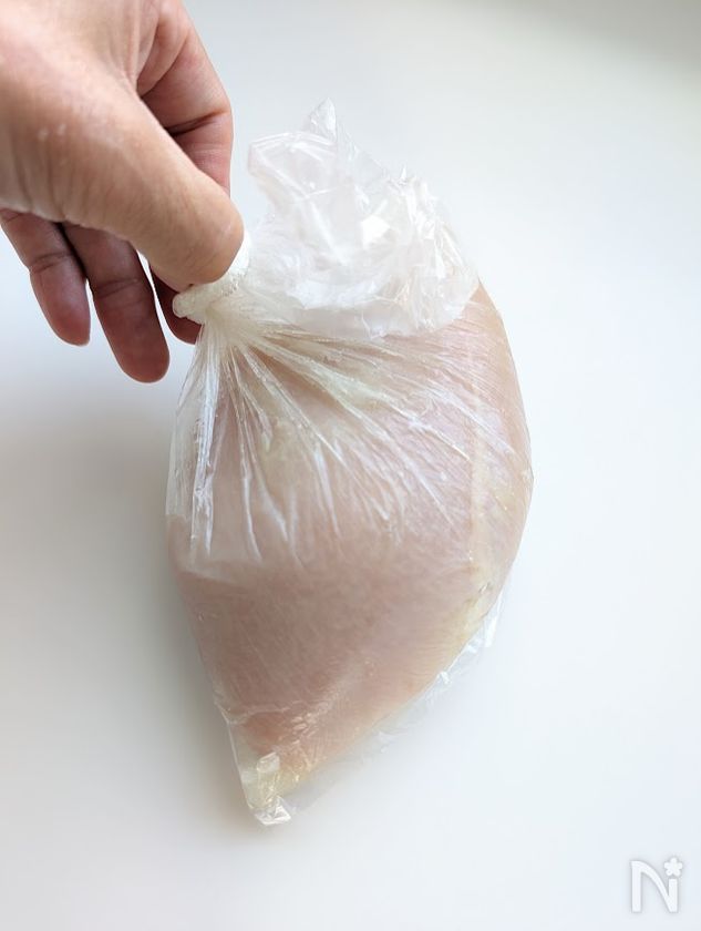 (1) ポリ袋(耐熱温度が100℃以上のもの)に鶏むね肉と【A】を加え、空気を抜いてポリ袋の口を閉じる。