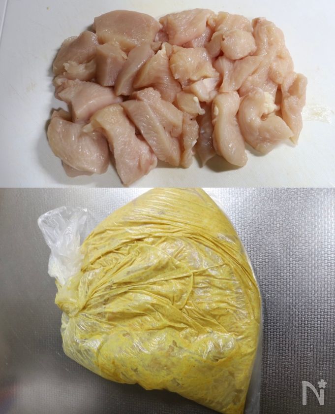 (下準備) 鶏むね肉は皮をとり薄く(幅1cmくらいで)ひとくち大のそぎ切りにする。ポリ袋に入れ、【A】を加えて全体をよく揉み込む。そのまま冷蔵庫で2時間〜一晩おいておく。