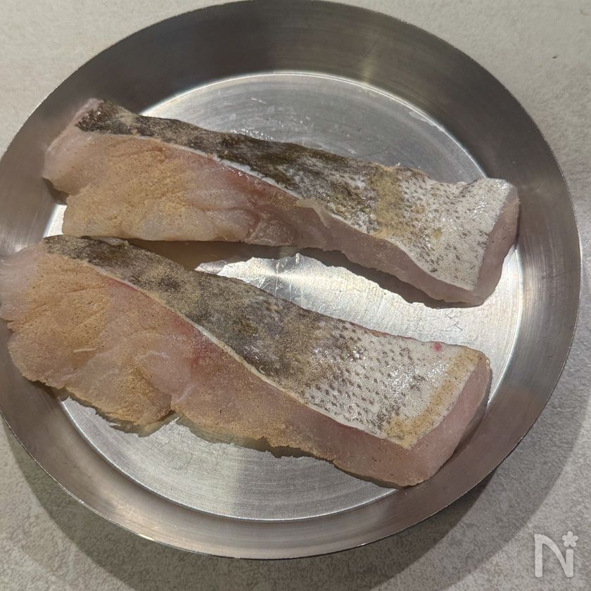 (1) たらはキッチンペーパーで水分をしっかり拭き取り、こしょうをまぶす。