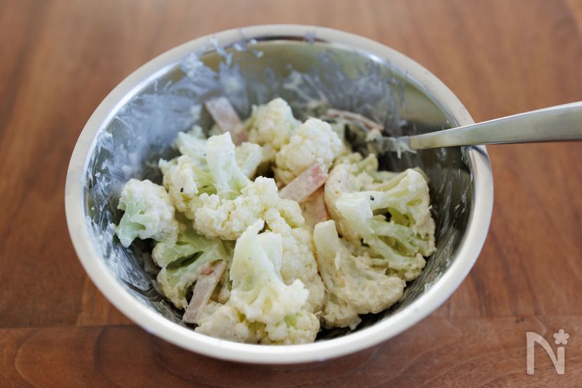 (2) ボウルに【A】を混ぜ合わせ、カリフラワーとハムを加えてよく和える。